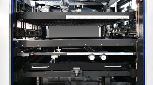 水平位置固定式清廢中模版配合漸進加速運動曲線清廢上框打廢點動作,清廢結構精簡,動作減少,打廢點瞬間力度加大,清廢動作更簡捷有效。